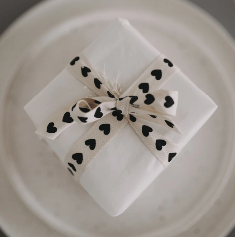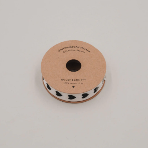 Mit dem Geschenkband *Herzen* von Eulenschnitt wird jedes Präsent zum Blickfang! Das 5 m lange Band aus hochwertiger Baumwolle liegt angenehm in der Hand und verleiht jedem Geschenk das gewisse Etwas. Die zarten schwarzen Herzen auf beigen Grund sorgen für einen liebevollen, natürlichen Look – perfekt für Geburtstage, Hochzeiten oder Weihnachten.