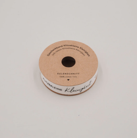 Das 5 Meter lange Baumwollband in warmem Naturton verleiht jedem Geschenk eine liebevolle Note. Der schlichte schwarze Schriftzug „Klitzekleine Kleinigkeit“ wiederholt sich entlang des Bands und zaubert beim Auspacken ein Lächeln ins Gesicht – ganz egal, ob zur Geburtstagsüberraschung, zum Mitbringsel oder als kleine Geste für zwischendurch.