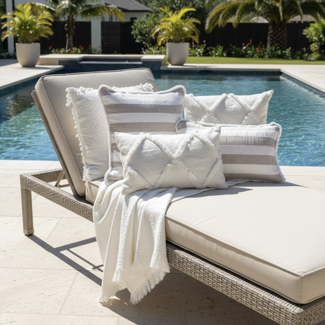 Verleihen Sie Ihrem Zuhause einen Hauch von Eleganz mit der Kissenhülle Boho Streifen beige-weiss umrandet von weissen Fransen von Manufacture Gallery .