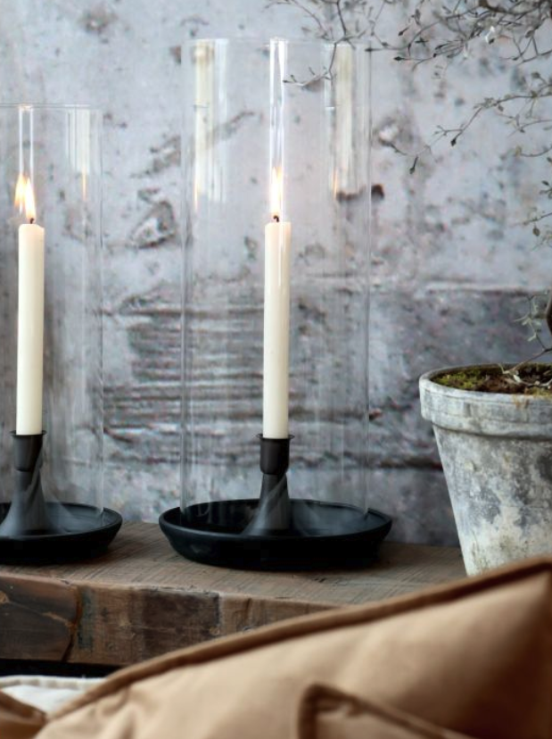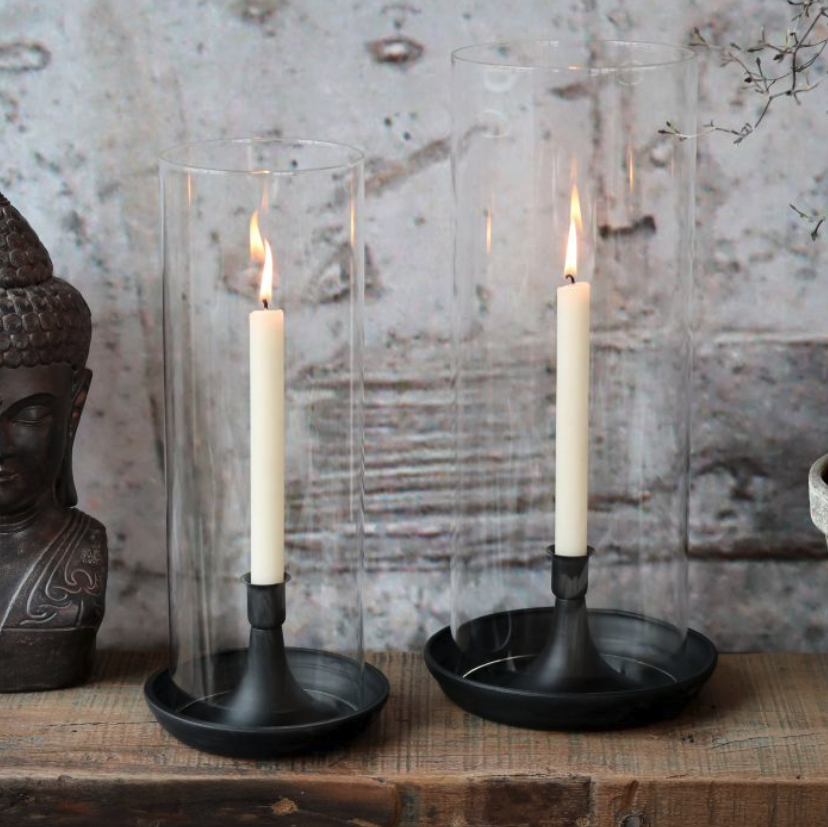Die schwarze Metallhalterung sorgt für sicheren Stand und bildet einen modernen Kontrast zum klaren Glaszylinder. Ob auf dem Esstisch, Sideboard oder im Außenbereich – das Windlicht schützt die Kerzenflamme zuverlässig vor Zugluft und verleiht Ihrem Zuhause eine warme, gemütliche Atmosphäre.