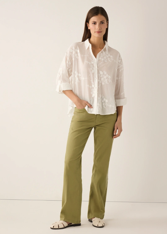 Die wunderschöne Bluse von MORE & MORE mit dekorativer Allover-Bestickung sieht mit verwaschener Jeans und Sneakers einfach super aus.