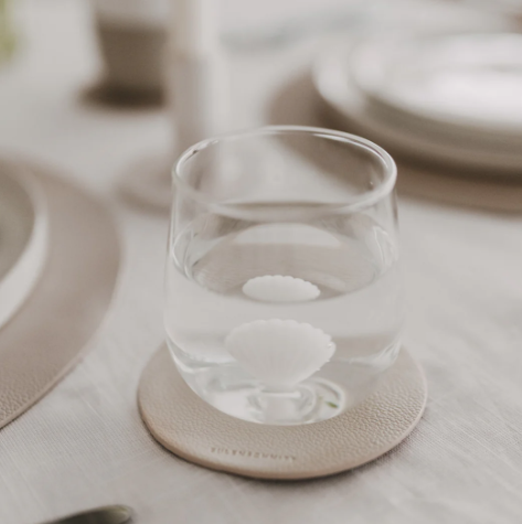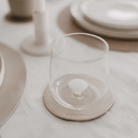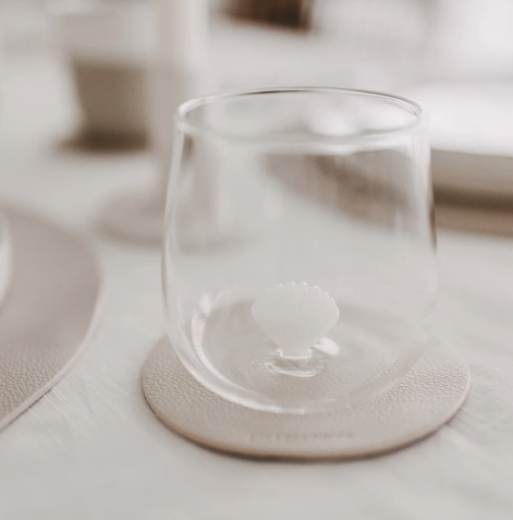 Im Inneren des Glases schwebt eine filigrane 3D-Muschel in zartem Weiß, die dem Glas eine ruhige, natürliche Eleganz verleiht. Wie ein kleiner Fund aus dem Sand wirkt sie leicht und unaufdringlich – und wird dennoch zum stilvollen Blickfang auf deinem Tisch.