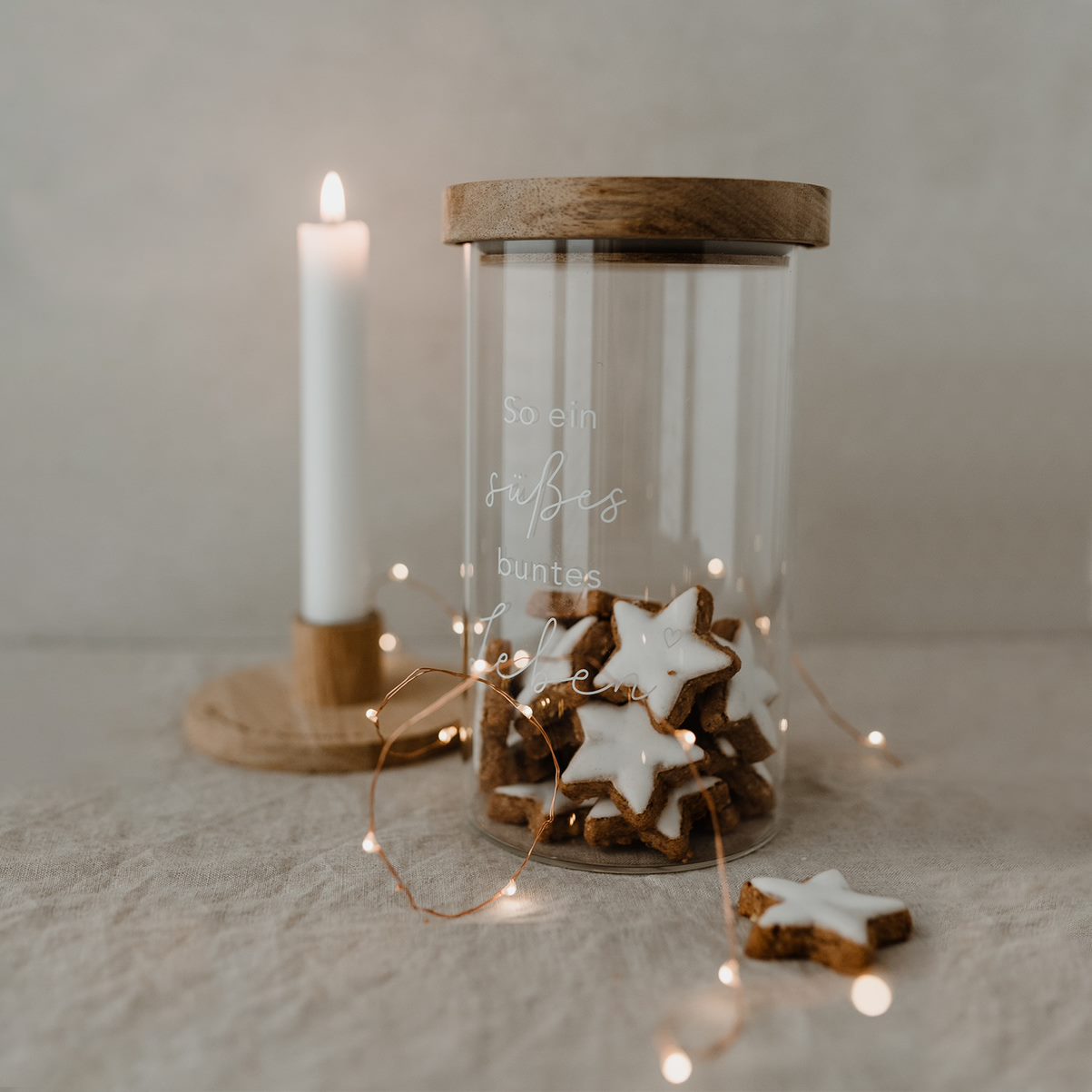 Entdecke dieses wunderschöne und praktische Vorratsglas Süßes Leben 19 cm aus Borosilikatglas mit Akazienholz Deckel.