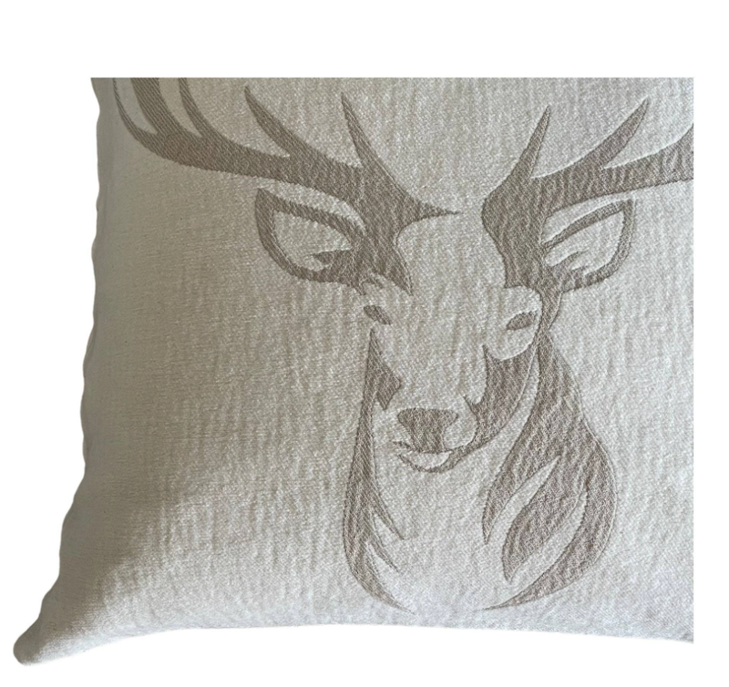 Der eingewobene taupefarbene Hirsch auf dem Offwhite-Hintergrund verkörpert einen modernen Chalet-Style, der rustikal und stilvoll zugleich ist. Hergestellt aus 100% reiner Baumwolle, bietet diese Kissenhülle nicht nur ästhetischen Genuss, sondern auch Nachhaltigkeit und dauerhafte Qualität.