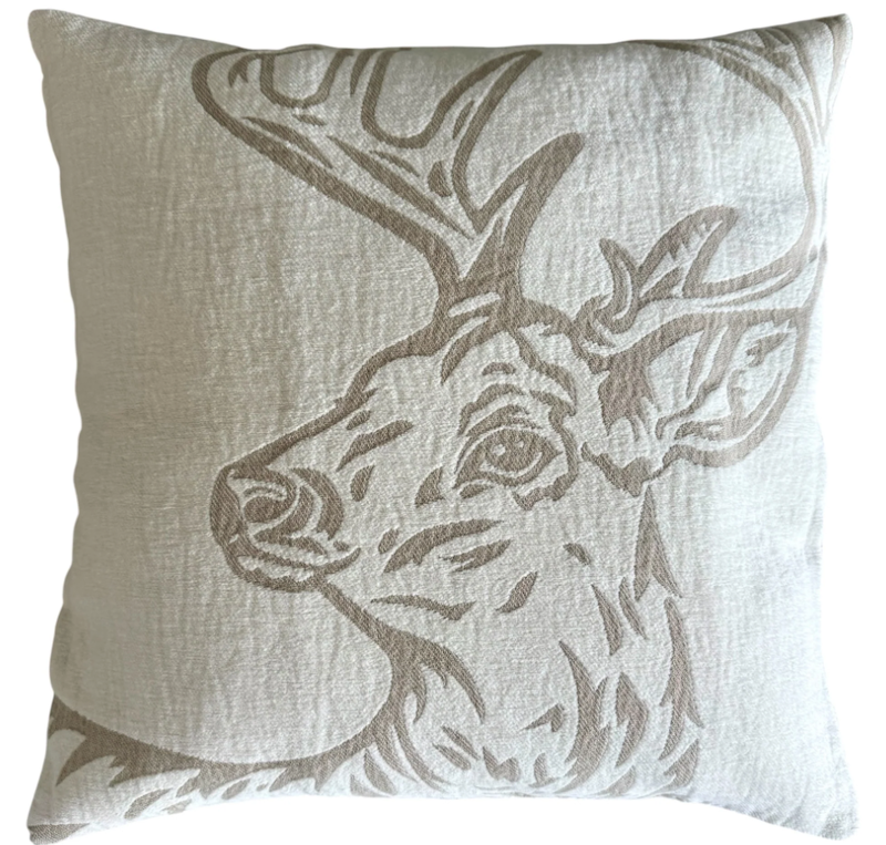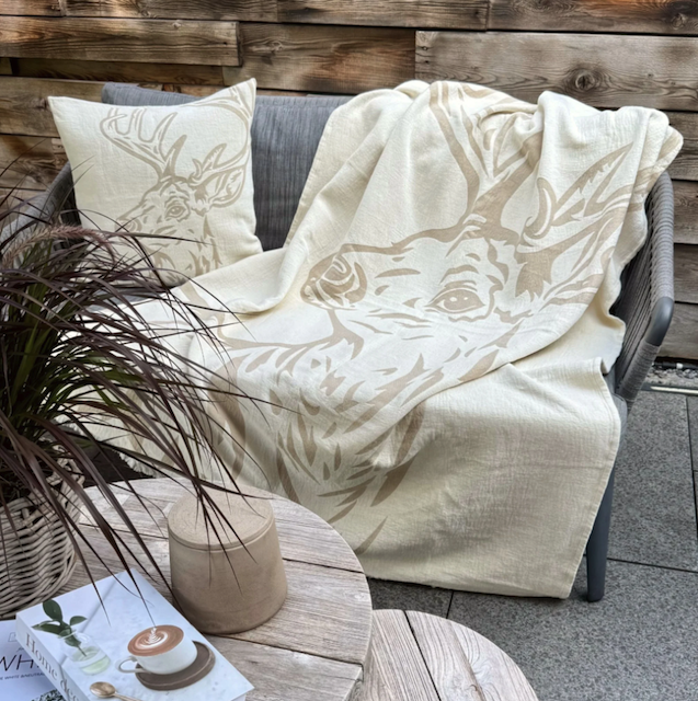 Das eingewobene Hirsch-Portrait auf dem Offwhite-Hintergrund verkörpert modernen Alpen- und Chalet-Stil – rustikal und gleichzeitig elegant. Hergestellt aus 100 % Baumwolle, steht diese Kissenhülle für Nachhaltigkeit, Langlebigkeit und Qualität.